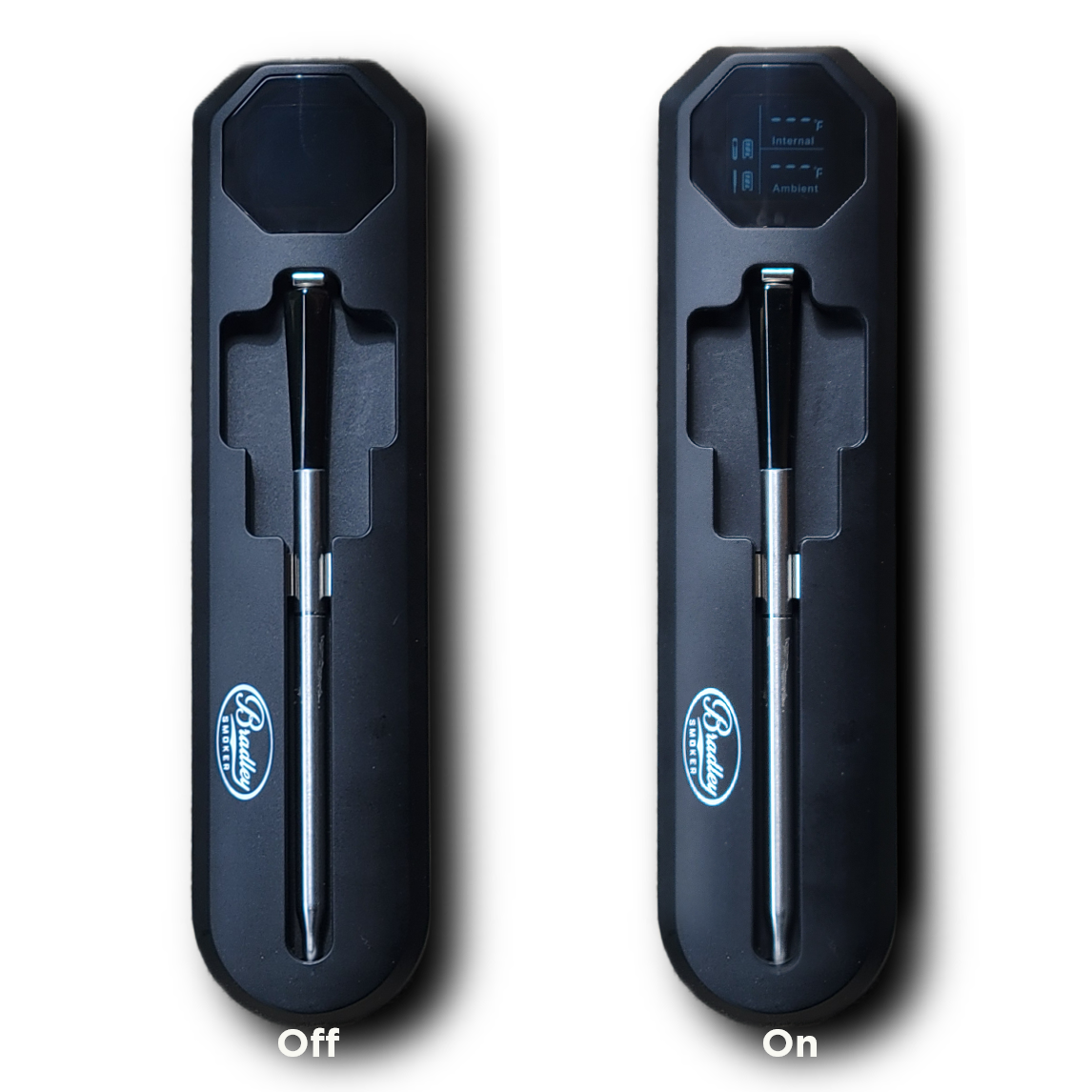 Take the guesswork out of smoking and curing. The Bradley Smart Wireless Meat Thermometer is built for anyone who values accuracy and consistency, from wild game to fresh-caught fish to home-raised meats. With dual-sensor technology to monitor both internal meat temp and ambient chamber heat, this sleek, all-in-one probe delivers pinpoint accuracy in every cook. No tangled wires. No hovering over the smoker. Just clear, real-time readings right on your mobile device through the Temprobe App, so you’re always in control — from your backyard, your kitchen, or your recliner. Crafted to perform. Built to last. Styled to impress. Key Features • Dual Sensors: Monitors internal meat temp and ambient chamber temp simultaneously • Temprobe App: Real-time Bluetooth temperature tracking on your smartphone • High-Heat Performance: Engineered to withstand high-temperature cooking environments • Rechargeable Cradle: Sleek magnetic dock with clear charging indicators • Compact & Durable: Built for rugged use and easy storage Specifications Booster Dimensions: 1.09" x 1.75" x 0.94" Display: 0.79" x 0.79" VA screen Probe Range: Internal 32°F-212°F ( 0°C – 100°C)| Ambient 32°F-572°F ( 0°C – 300°C) Connectivity: Bluetooth 5.0 Charge Time: 1 hour Certifications: FCC, CE, RoHS